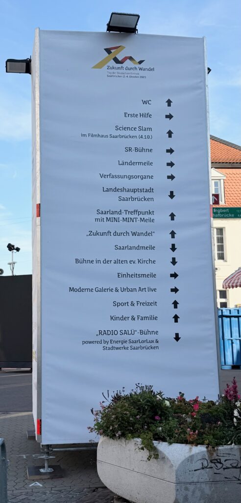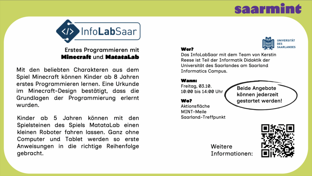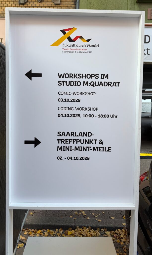 Die Mini-MINT-Meile ist Teil des Saarland-Treffpunkts. Der Treffpunkt ist an vielen Stellen sehr gut ausgeschildert!