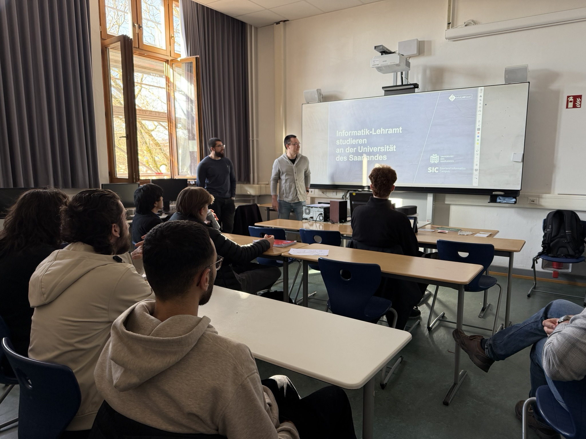 Am Dienstag, den 03.03.2026, durften wir einen Leistungskurs am Otto-Hahn-Gymnasium in Saarbrücken besuchen und die Schüler*innen über die Lehramtsstudiengänge Informatik informieren. Vielen Dank für die Einladung!