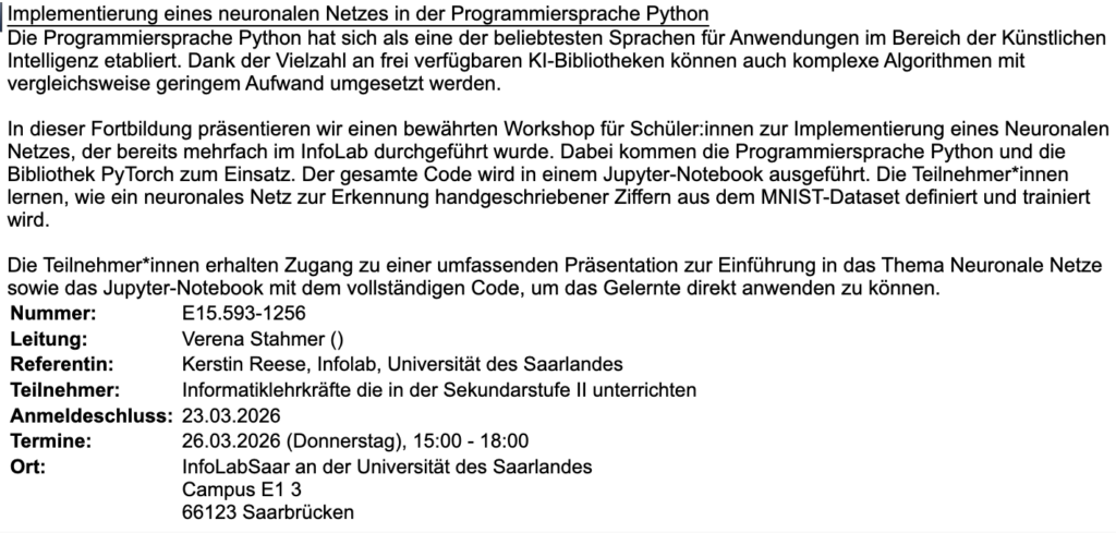 Am Mittwoch, den 26.03.2026, findet im InfoLab eine Lehrer-Fortbildung für den Bildungscampus Saarland statt.